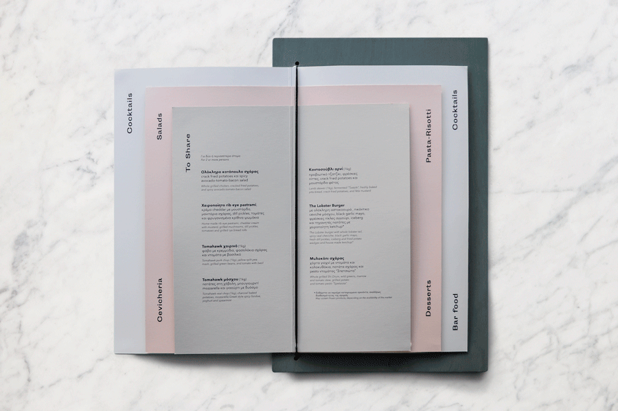 Back in 2019, the owners of the bar decided to add an all-day restaurant on the terrace, just above the existing bar. This way the bikini’s bottom acquired a top. We were asked to handle this transition by evolving the existing logo, creating a replaceable menu system as well as a website where one can either navigat upwards or downwards – depending on the mood.