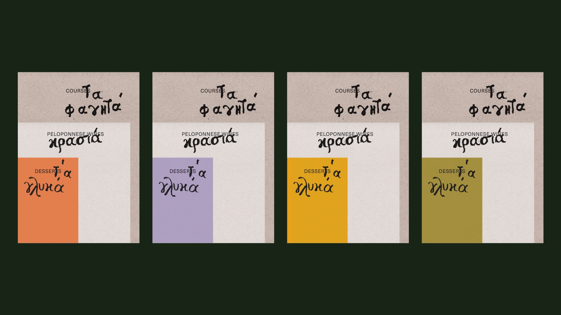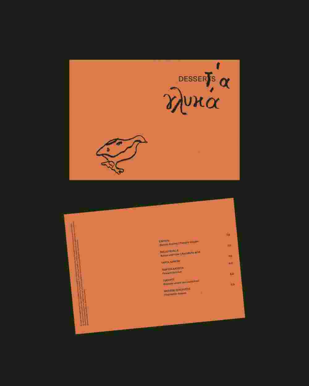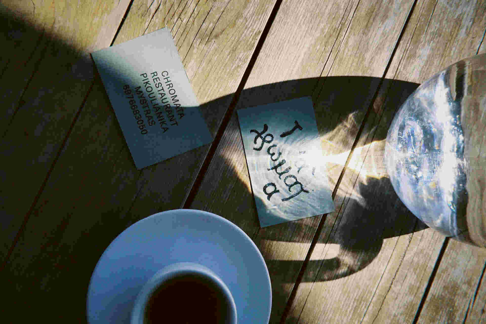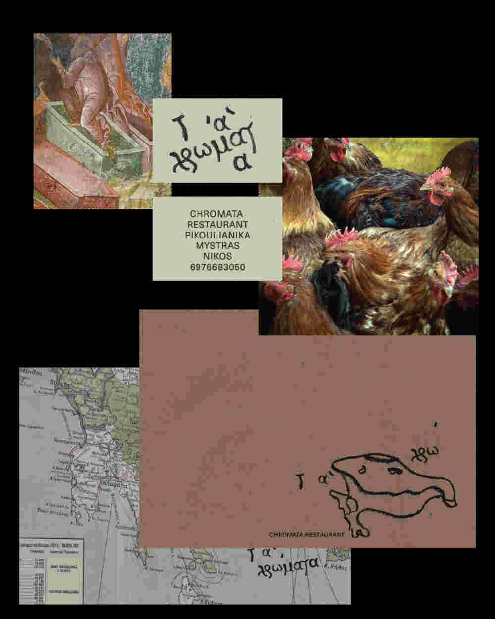 Embodying the restaurant’s connection to nature, history and craftsmanship, our proposal translates this spirit into a visual identity that feels at once timeless and personal. The logotype brings together two voices: CHROMATA RESTAURANT in a clear, modern typeface that provides structure and legibility, and χρώματα, hand-drawn with crayons, echoing both the playfulness of the place and Byzantine script. Rather than imposing colour artificially, the identity becomes a backdrop that lets the true colours of Chromata emerge — from the ingredients and dishes to the garden, the architecture, and the surrounding landscape.