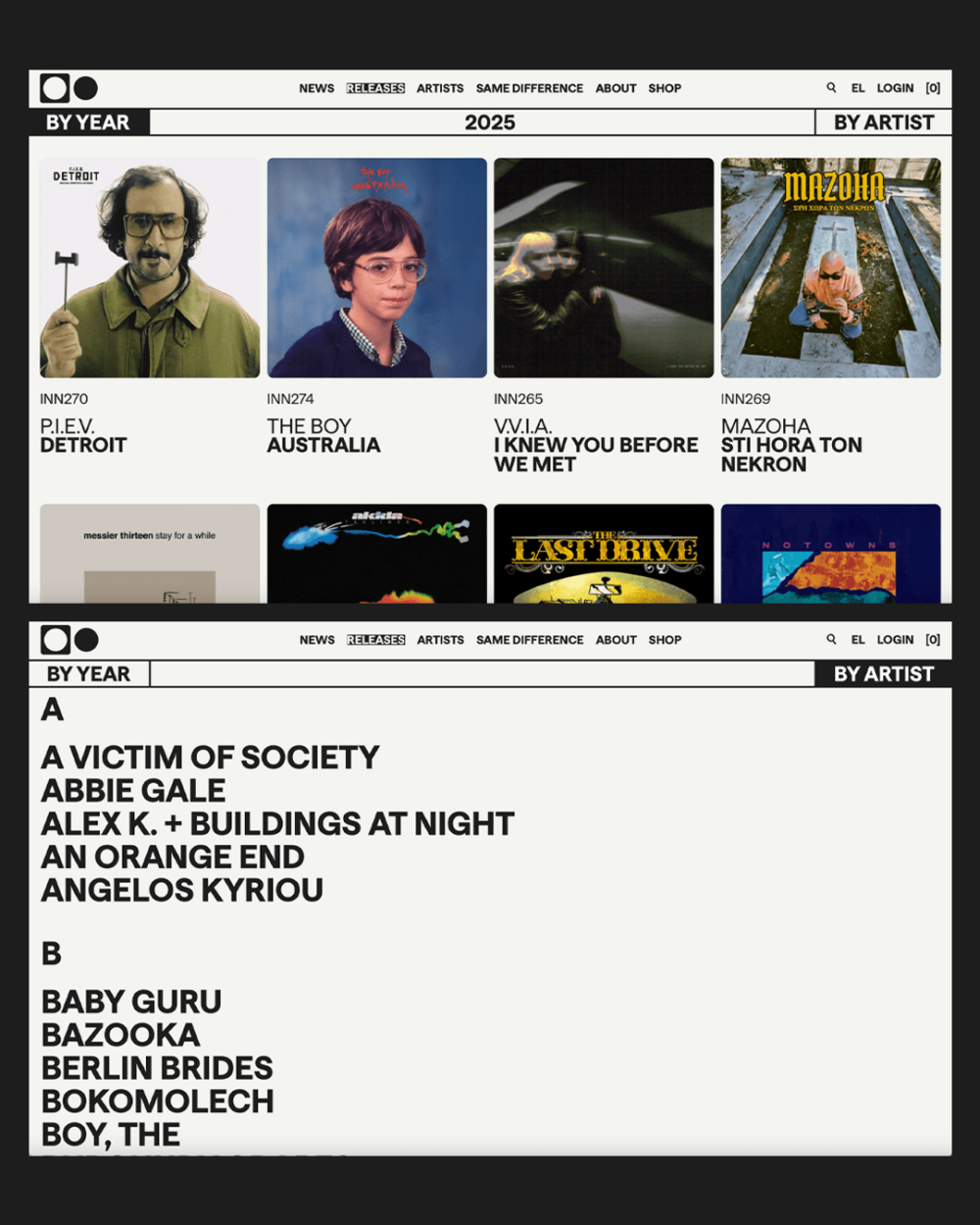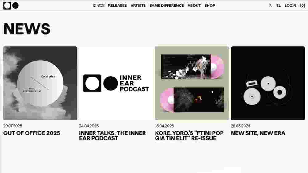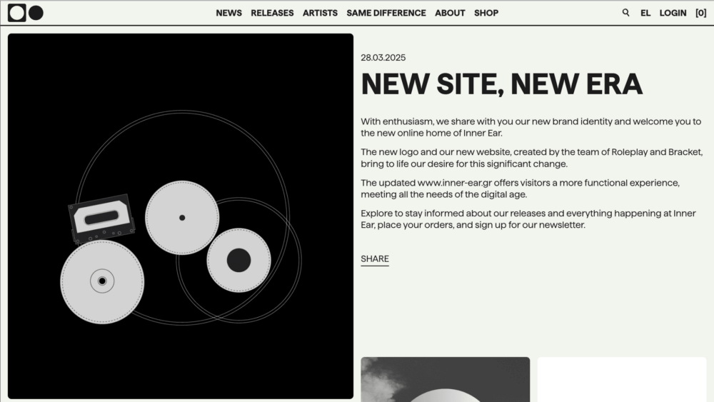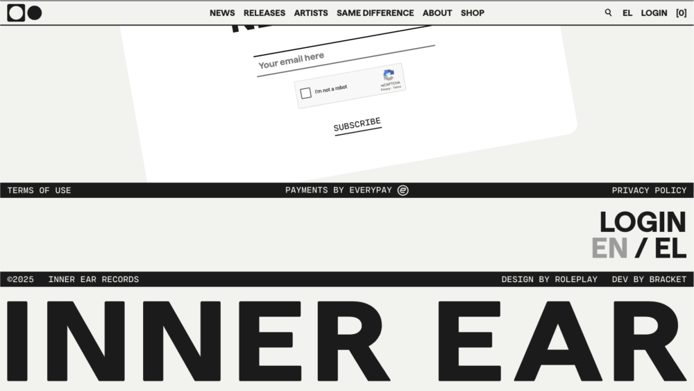 This is the second time Roleplay are working on Inner Ear’s e-shop. The original website was created by Division Binaural in 2013 and in 2018 we were brought on to expand and upgrade it. Now, to reflect Inner Ear records rebranding, we collaborated again with Bracket Dev Studio to rebuild the record label’s website mostly from scratch while keeping its predecessor’s UX values.With a drastically redesigned checkout experience and multiple interactive elements, the new e-shop features an audio player to preview the latest releases, custom-coloured product pages to match each release’s mood and a dedicated page for Same Difference, Inner Ear’s experimental sub-label.