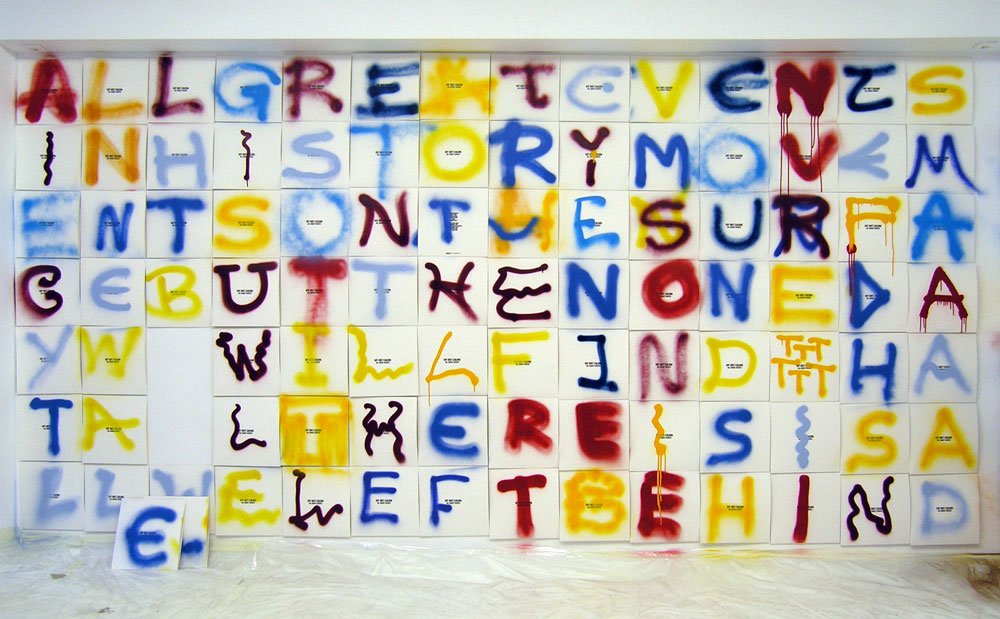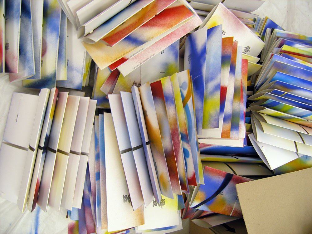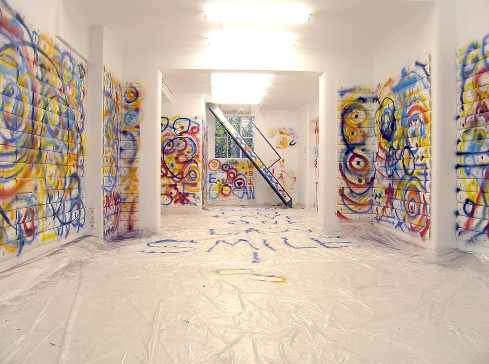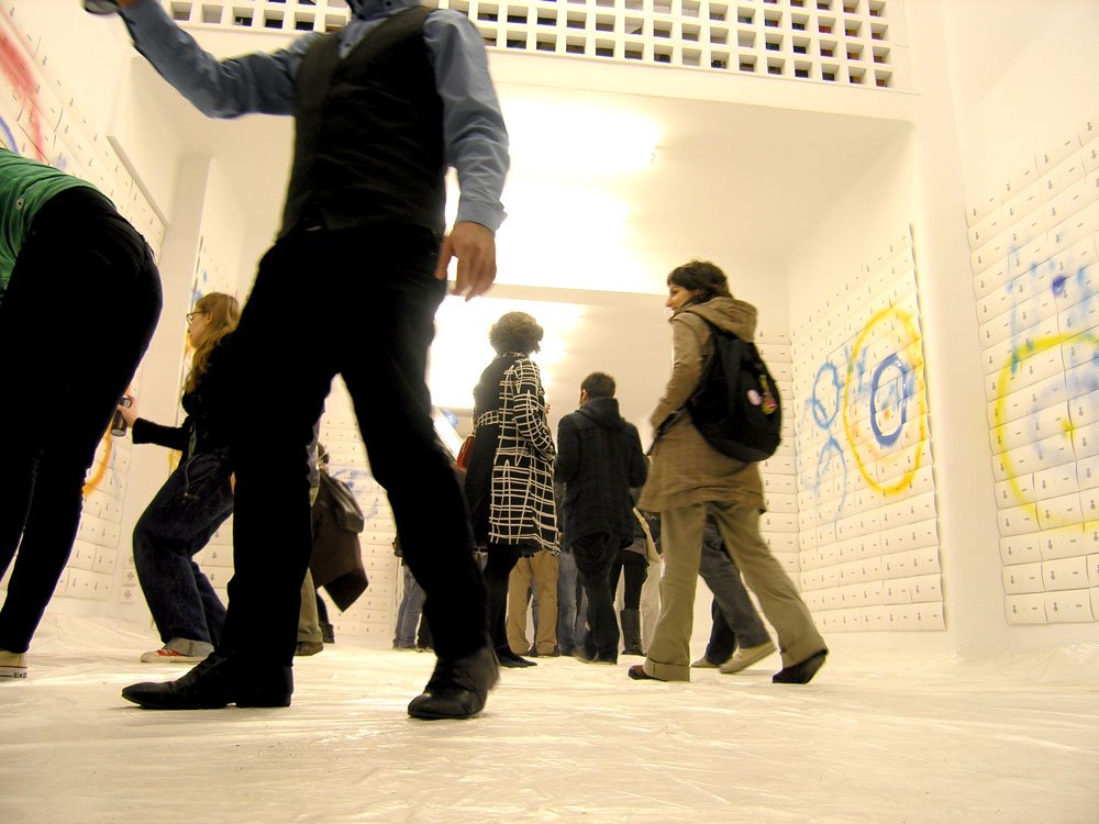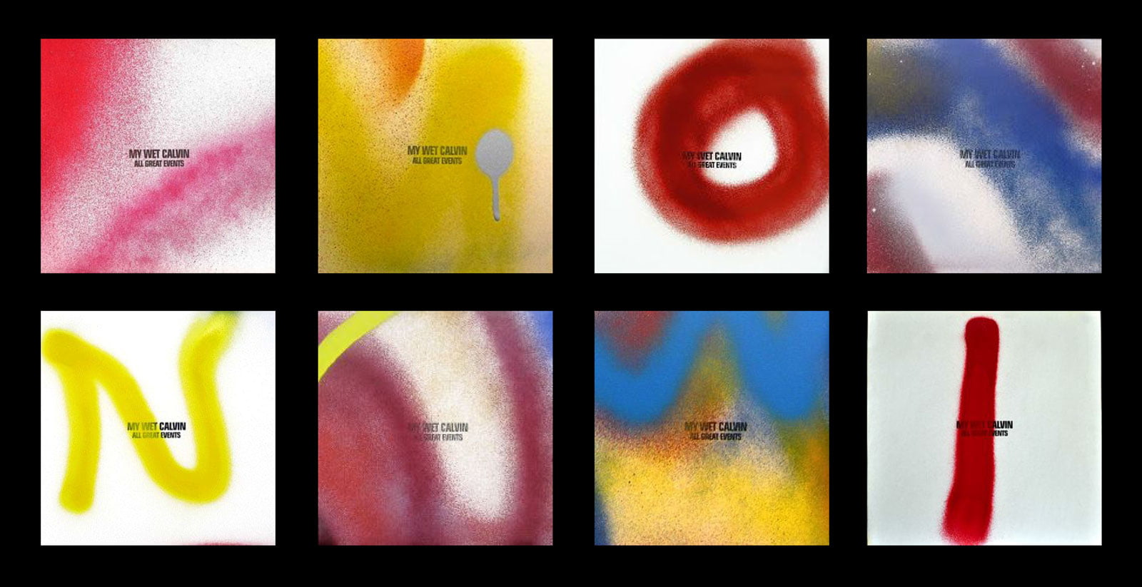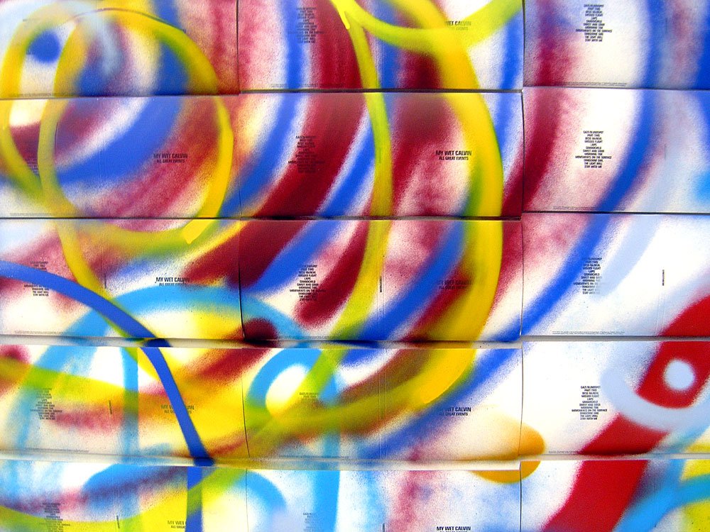 In December 2009, My Wet Calvin put 1000 CD digipacks and 100 LP jackets onto Six D.O.G.S. project space walls, all blank with minimal black typography. After a couple of days, friends and passers-by helped spray paint the walls as a continuous canvas. The result was exhibited for 3 days and then was dismembered. Every copy has its own unique sleeve, still being part of a puzzle that can never be seen complete again.