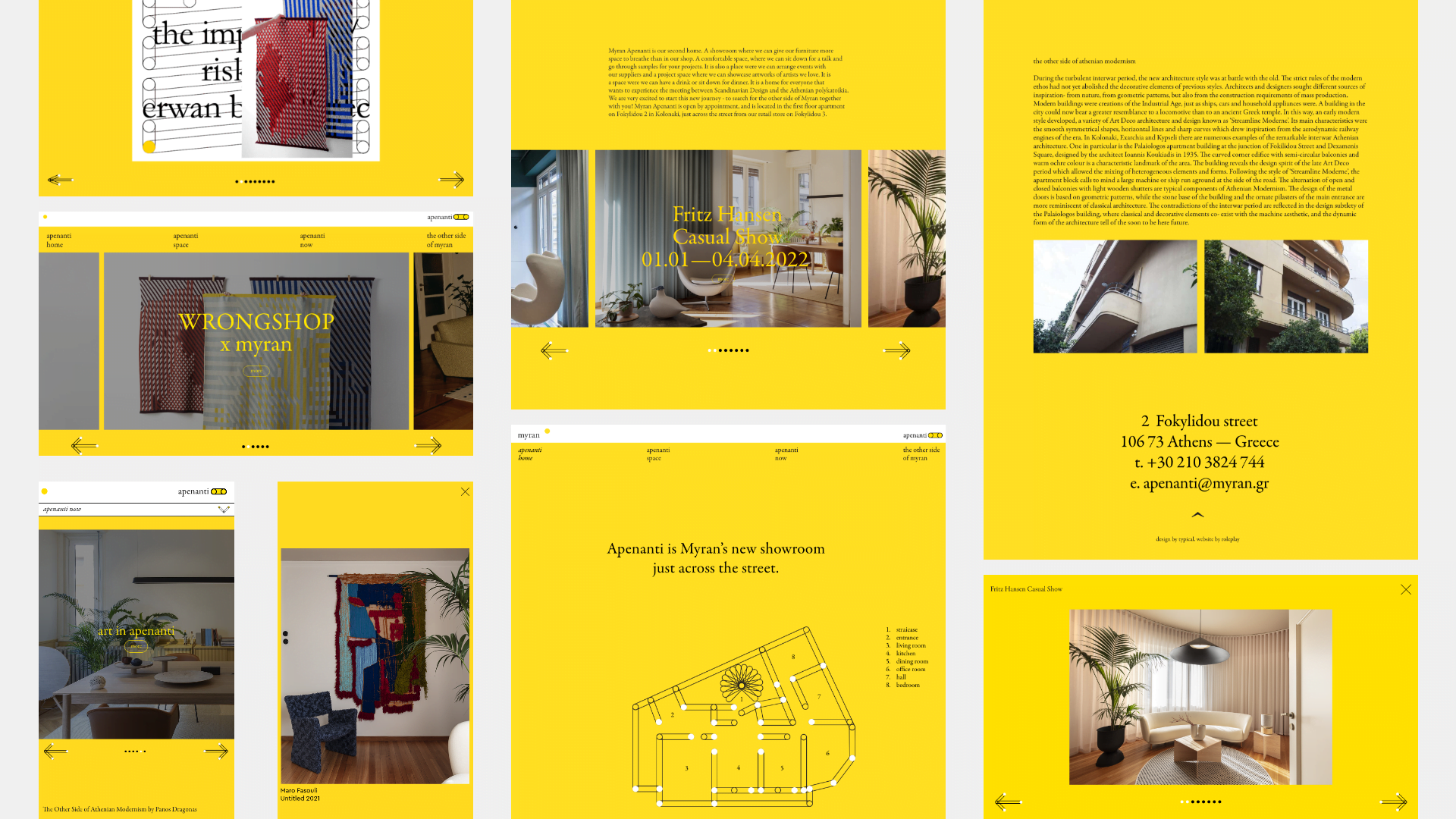 Apenanti – across the street in Greek – is a new showroom across the actual Myran shop that presents the very best of Scandinavian Design in Greece. Apenanti is a project space were events take place to showcase artworks and design objects of Scandinavian designers. It is a home for everyone who wants to experience the intersection between Scandinavian Design and the Athenian polykatoikia. We implemented a one-pager to host Apenanti’s activity and spaces, on a user-friendly interface.