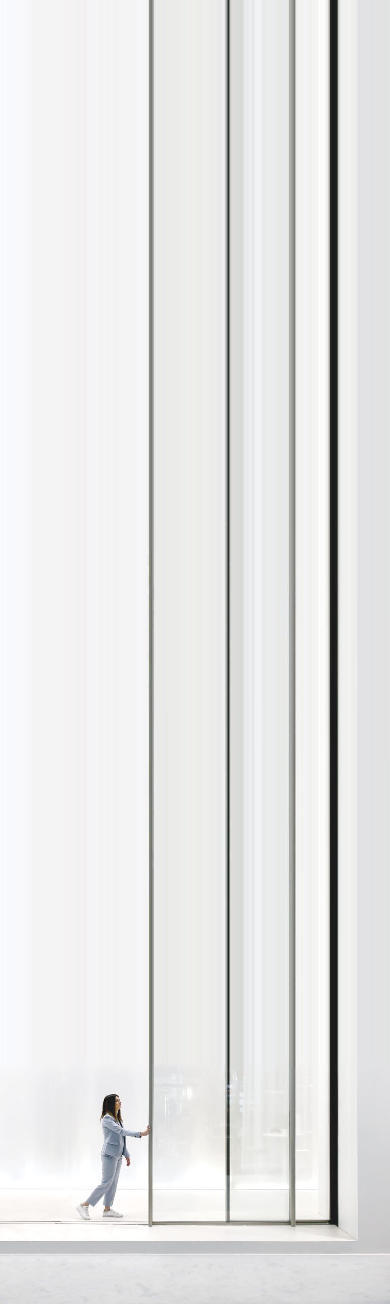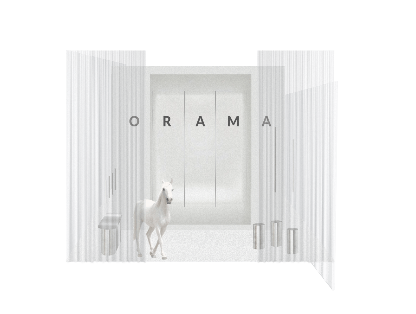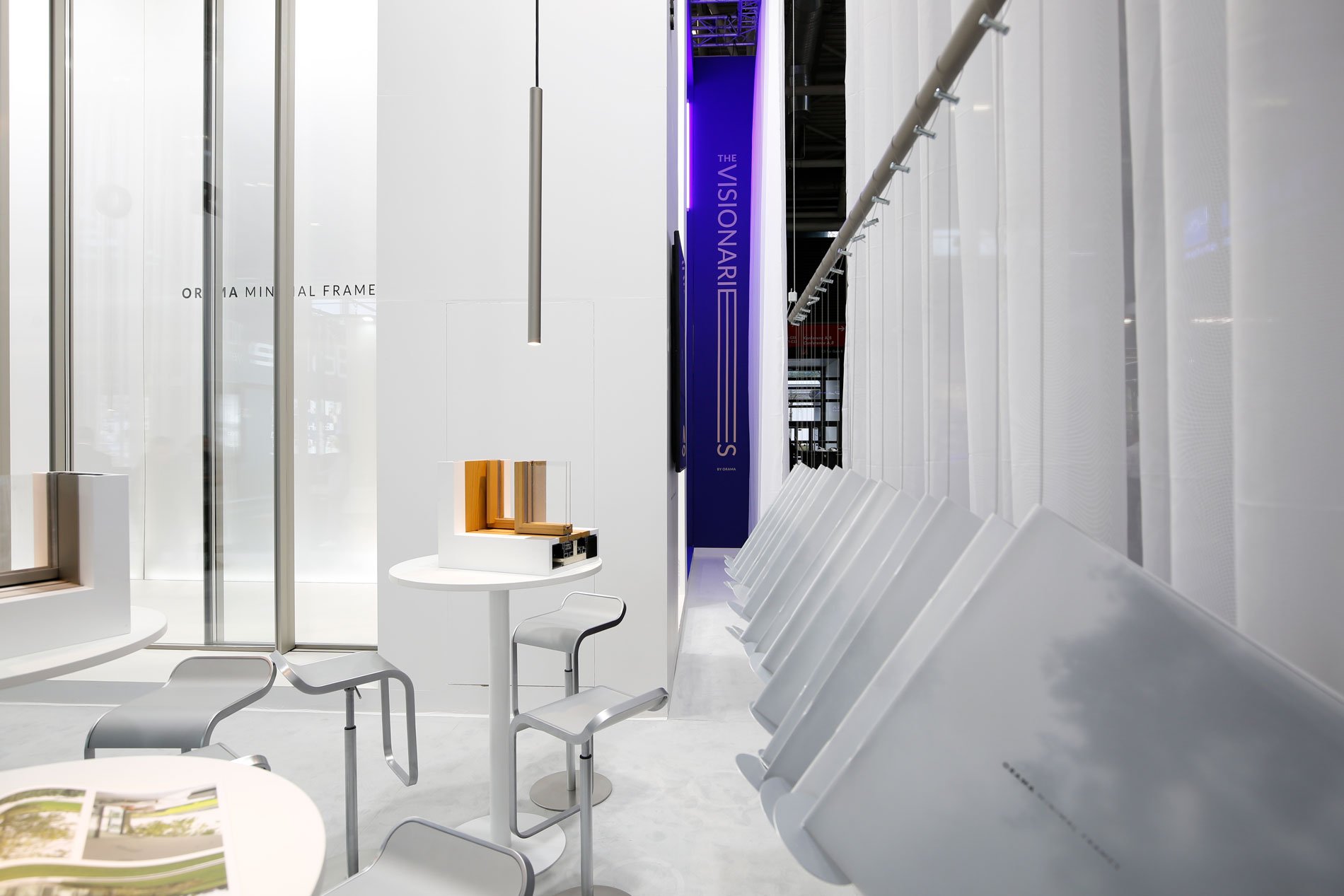 The exhibition booth was designed for Orama’s participation in the BAU Munich 2023 trade show. The design embodies a central focal point, a light installation that works as a backdrop for the featured exhibit – a 7m height minimal window system – crafting an illusion of boundless space. Surrounding the booth, white transparent curtains enhance privacy while fostering an inviting and whitewashed atmosphere. The space consists of an open layout, featuring a bar area, alongside a dedicated area for private meetings. A distinct blue zone within the booth, dedicated to Orama’s visual campaign, ‘The Visionaries’, integrates the brand’s identity with architectural design.