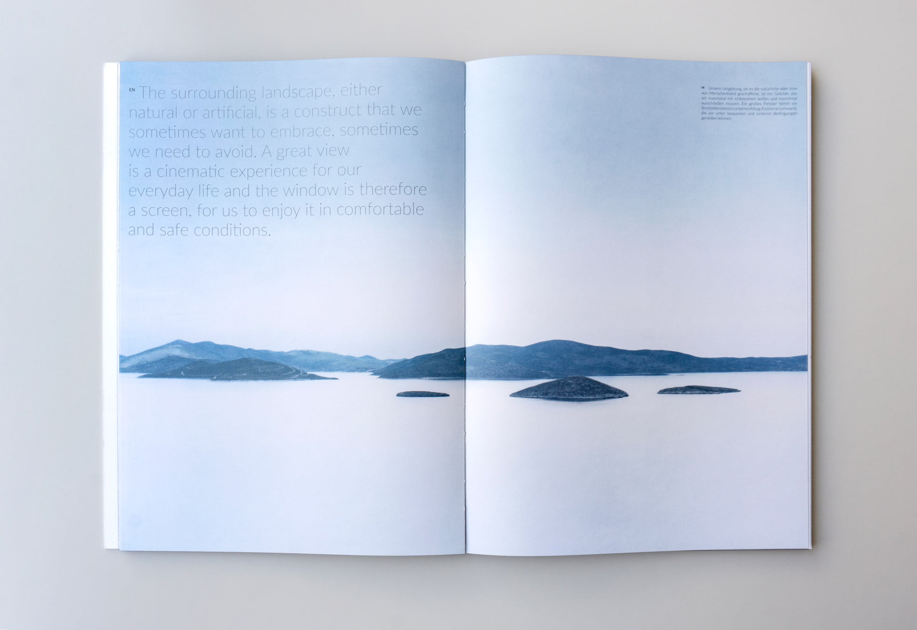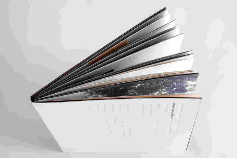 The aim was to create a large-format coffee table book that referred more to an architectural monograph than to a classic company book. Emphasis has been placed on bookbinding and thanks to the tailor-glued spine of the body which is not attached to the back cover, it allows the pages to be fully opened.