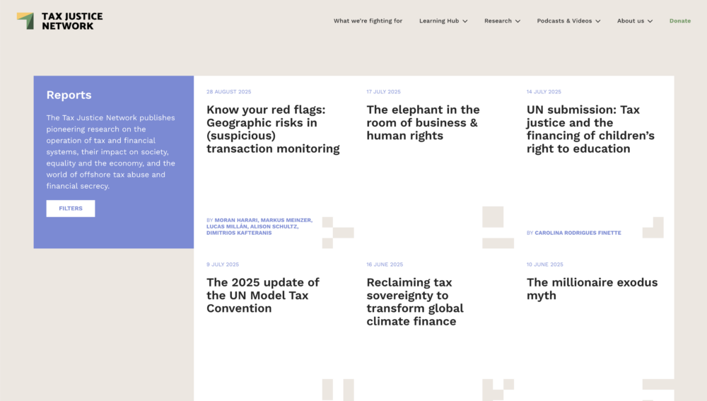 Tax Justice Network is a network of NGOs established in the UK in 2003 fighting the global tax injustice through research, video and audio.