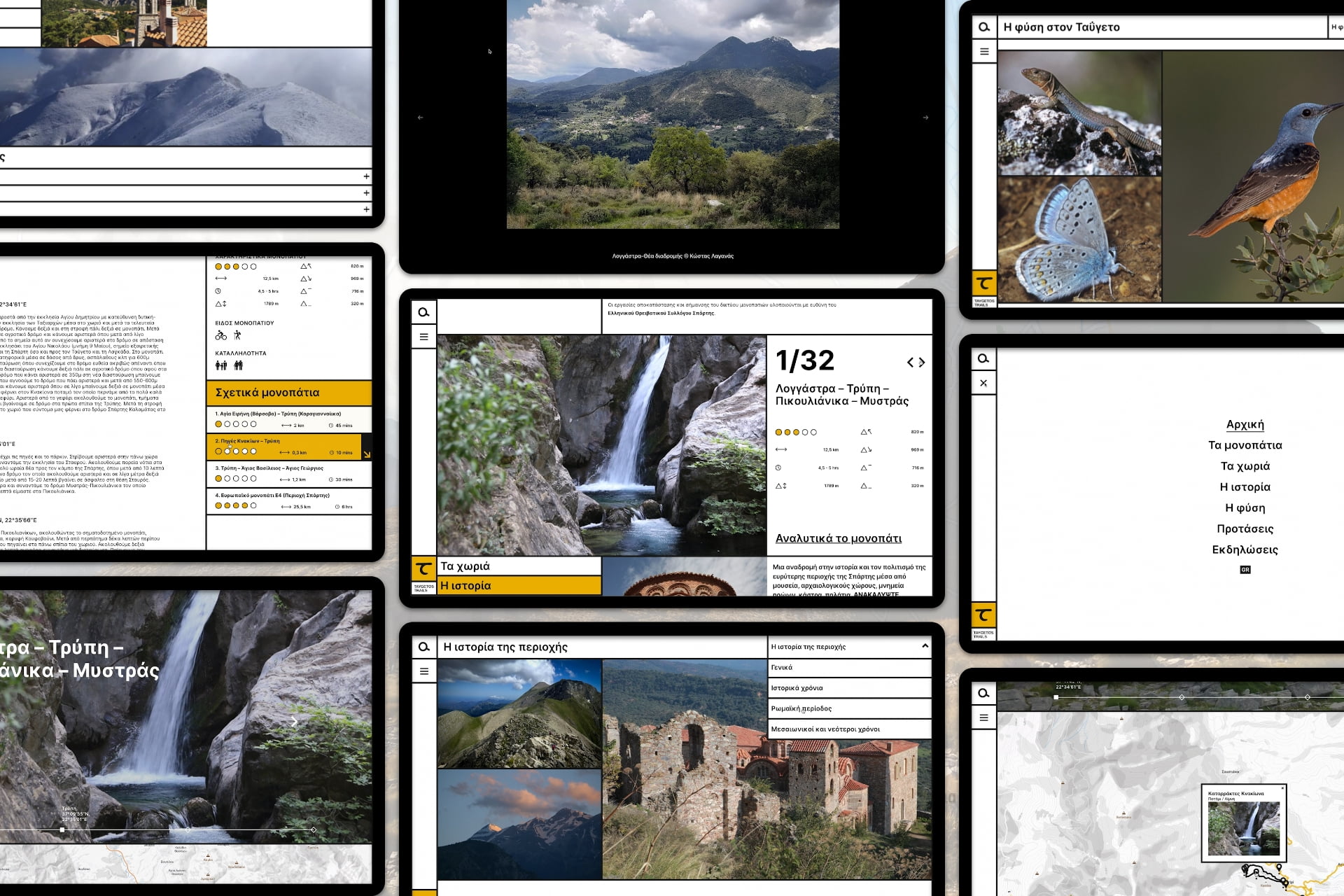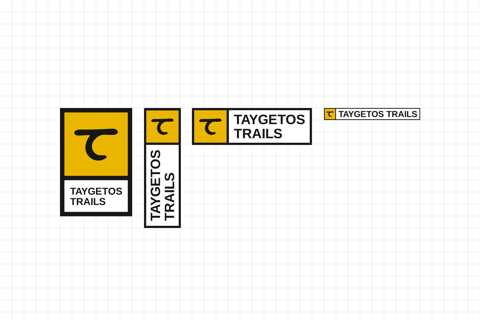 Our task was to redesign the existing logo and develop a new visual language which will be applied in trail markers, information and directional signages as well as in the presentation of the paths through a website. The handwritten letter “t” as the initial of both words in the name of the trail network was given to us from the beginning and its use was a prerequisite. The redesigned logo borrows the yellow color and bold frame from the recognizable European E4 trail markings and comes in several variations depending on the scale at which it will be used. We then introduced a canvas system with distinct frames creating layouts that refer to an open hiking map, an element that found full application in the information signages and the project’s website.