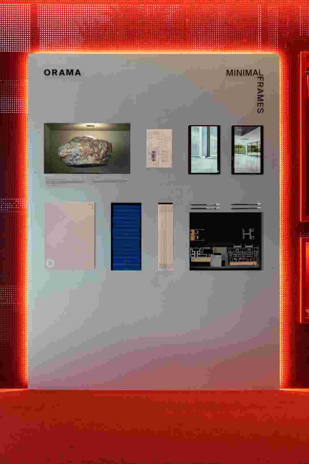 Inspired by the Cabinet of Curiosities, the modular structure transforms a ready-made metal shelving unit into a flexible showcase for products and promotional material. A dedicated display highlights the Orama minimal frame system.