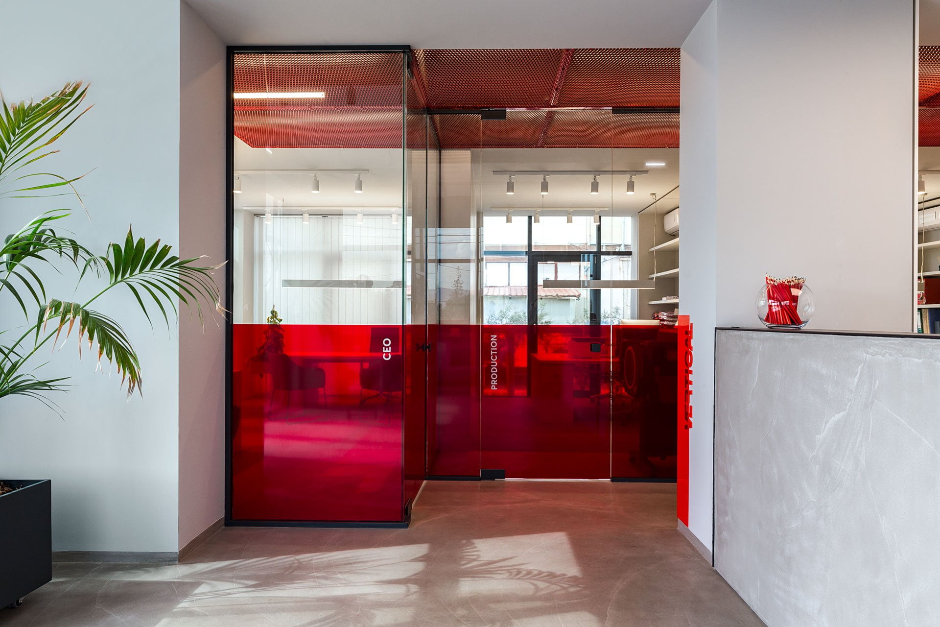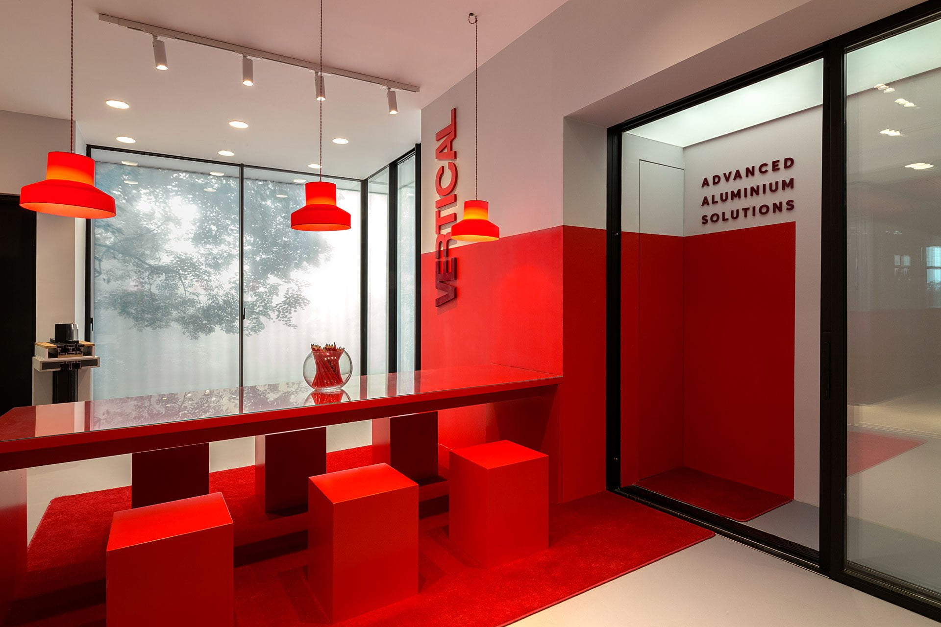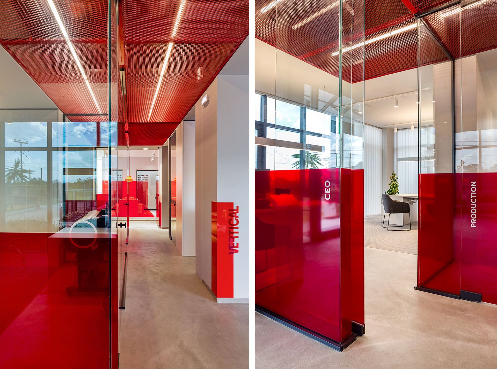 The red colour and the element of transparency were widely used to reflect Vertical’s identity. The extensive use of glass surfaces creates a sense of open space while the red perforated metal sheet running along the ceiling indicates circulation unifying the public spaces with the private offices.