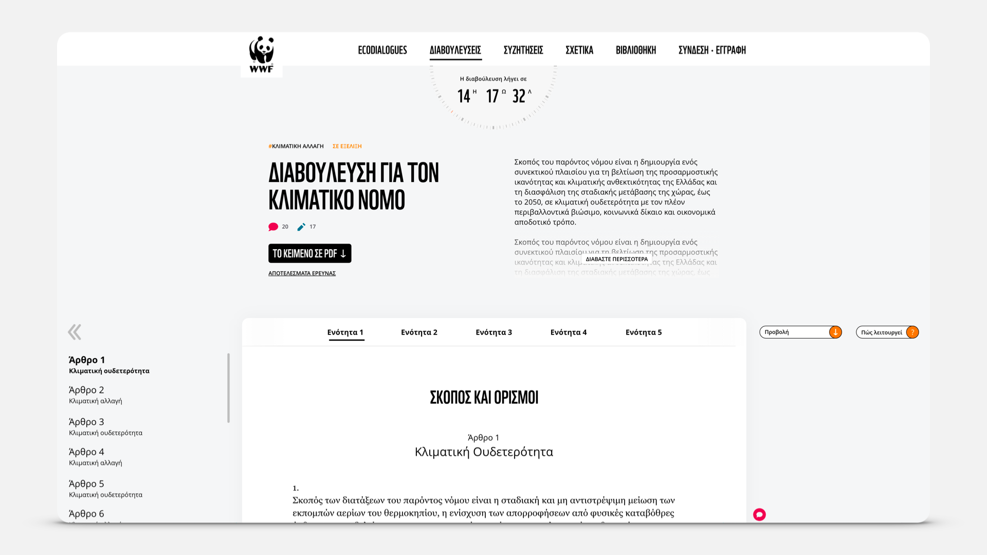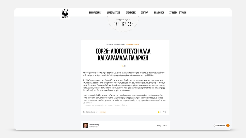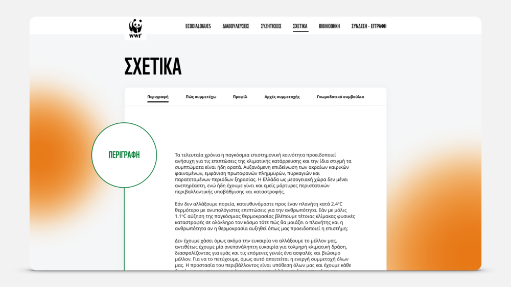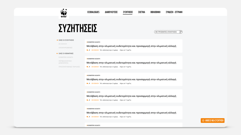 Ecodialogues is the sequel of the digital public consultation & petition platform on the National Climate Law we launched with WWF Greece in 2021. The new, expanded platform can host multiple simultaneous consultations as well as open discussions for climate and nature policies that can be initiated either by NGOs or the citizens themselves. Ecodialogues also employ a library of related papers, reports and publications as well as a gamified user account that encourages citizens to add contributions and propose discussions.